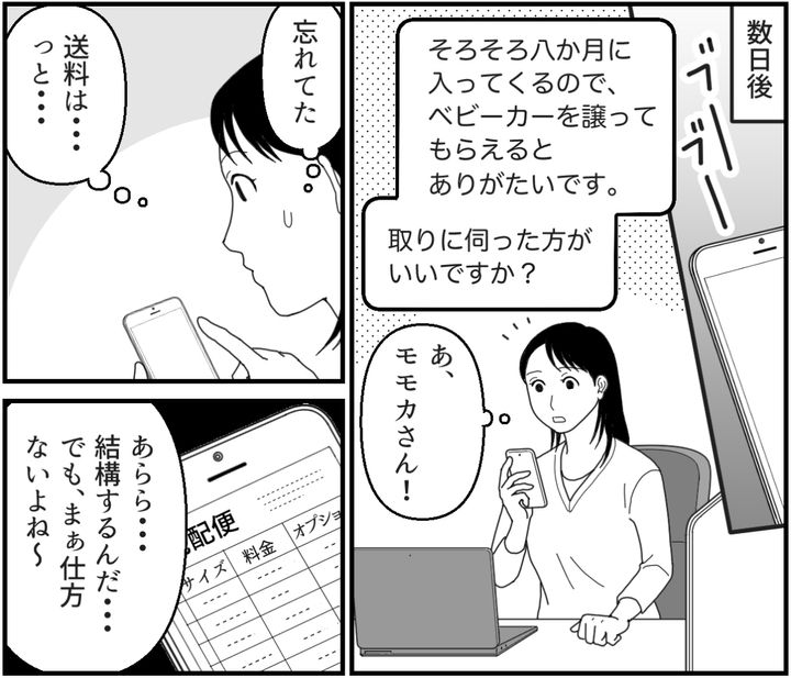 モモカさんから連絡があり、わざわざ取りに来てもらうのも申し訳ないと思った私。もともと1万円程度でお譲りするつもりだったので、送料については厚意で負担しようと思って返信したのです。