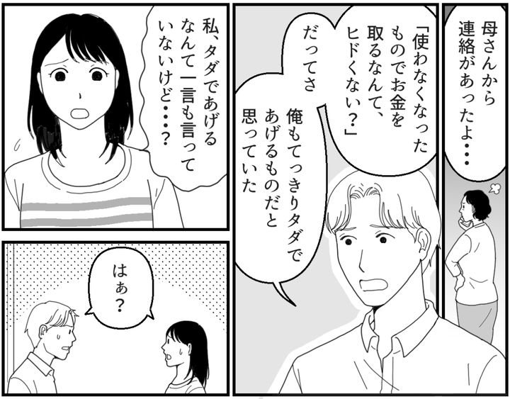 しかしモモカさんからは既読スルーされてしまいました。しかも帰宅してきた夫からは、義母が「お金を取るの?」とクレームをつけてきたと聞かされます。夫も「てっきりタダであげるものだと思っていた」と……。