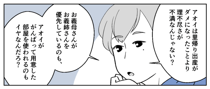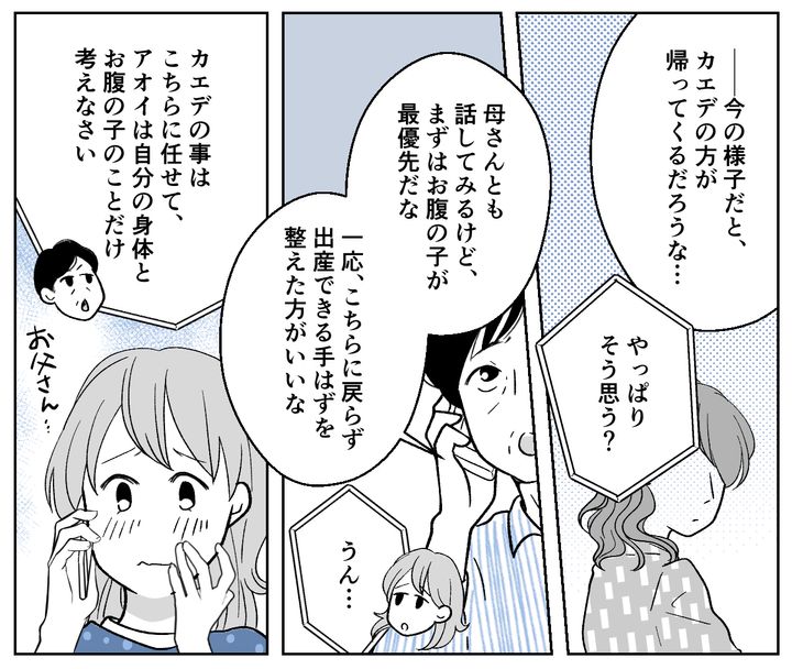 私(アオイ、29歳)はもうすぐ第一子を出産予定。実家から徒歩20分ほどの場所に夫(テツヤ、30歳)と2人で住んでいます。私は里帰り出産のために、実家の自室をコツコツ掃除してきました。それなのに、離婚することになった姉(カエデ、34歳)が甥2人(幼稚園児)とともに私の片付けた部屋を使うから、と母に里帰りの中止を求められたのです。母は疲れ切っている姉を放っておけないと言いますが、私は身勝手な母と姉が許せません。