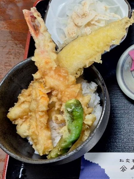 サクサクふわふわの大きな穴子の天ぷらがのったやまよ丼、甘辛いたれにご販がすすみます。