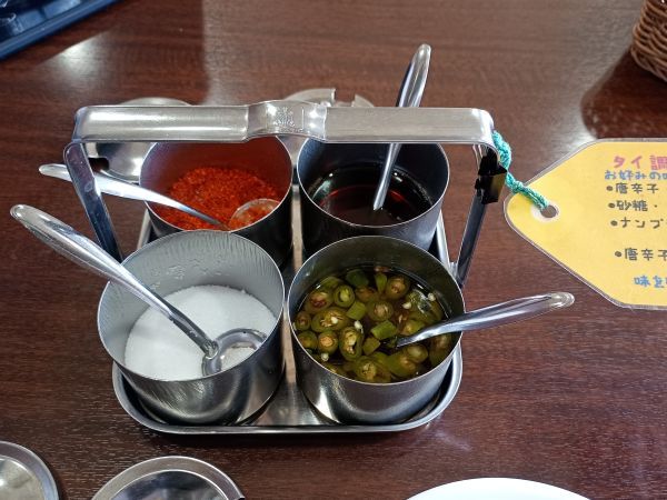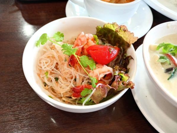 「タイ風春雨サラダ」は、さっぱりとした味付けで食べやすく、暑い日にもぴったり。テーブルに置かれた調味料セットの中から、唐辛子酢を加えることで、さらにさわやかな風味を楽しめました。