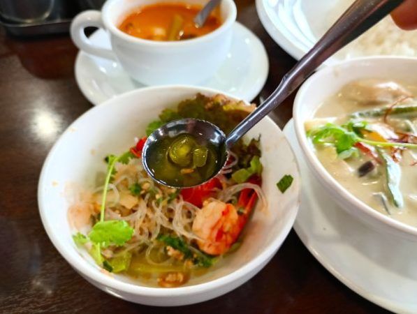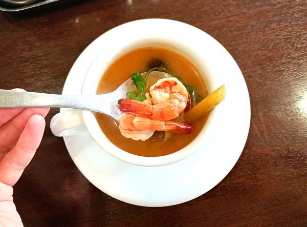 「トムヤムクンスープ」には、ぷりっとしたエビがたっぷり入っていて、スパイスの香りとともに贅沢な味わい。酸味と辛味のバランスが絶妙で、スプーンをすくう手が止まりません。