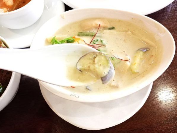 そしてメインの「グリーンカレー」は、ココナッツミルクのまろやかさが際立つ、辛さ控えめの優しい味。ナスなどの野菜もたっぷり入っていて、ヘルシーなのに食べごたえも十分です。タイライスとの相性も抜群で、お腹も心も大満足のランチとなりました。