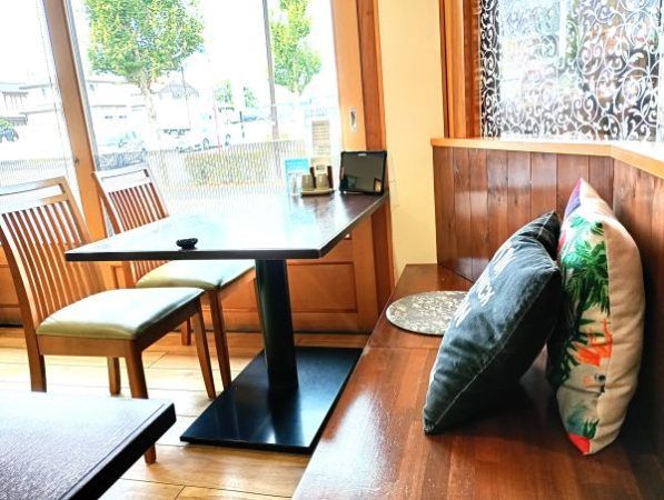 店内は自然光が差し込む明るく開放的な雰囲気で、ベンチシートにはクッションが並べられ、ゆったりとくつろげるお洒落な空間が広がっています。