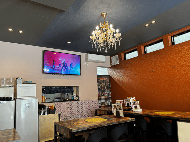 韓国の色彩である黒と紅が店内にK-POPが流れているモニター。韓国気分・新大久保の雰囲気を味わえます。