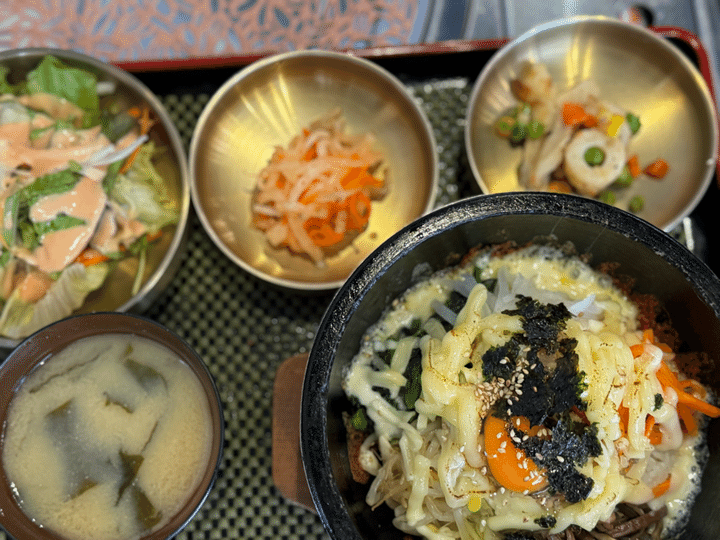 石焼ビビンバ定食 チーズ追加。サラダ・小鉢とお味噌汁がついています。チーズの乗っている石焼ビビンバは初めてです。器が熱々なのでおこげがたくさんできました。チーズもカリカリになってさらにカリカリです。コチュジャンでできたタレは自分で調整して掛けることができます。タレの部分にできたおこげは香りと味がさらに食欲を増します。