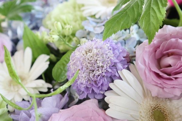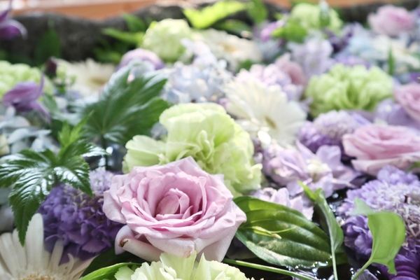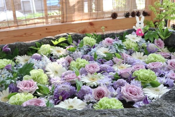 そんな素敵な神社の一角には色彩豊かな花手水が登場。6月下旬から7月中旬にはバラやガーベラ、アジサイなど淡い生花がお水に浮かんでいました。