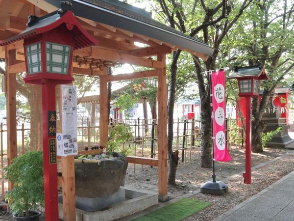 花手水の場所は鳥居から本殿へ向かう参道の左手。やや広い神社ですが、「花手水」と描かれたのぼりを目印にすぐ見つけることができそう。