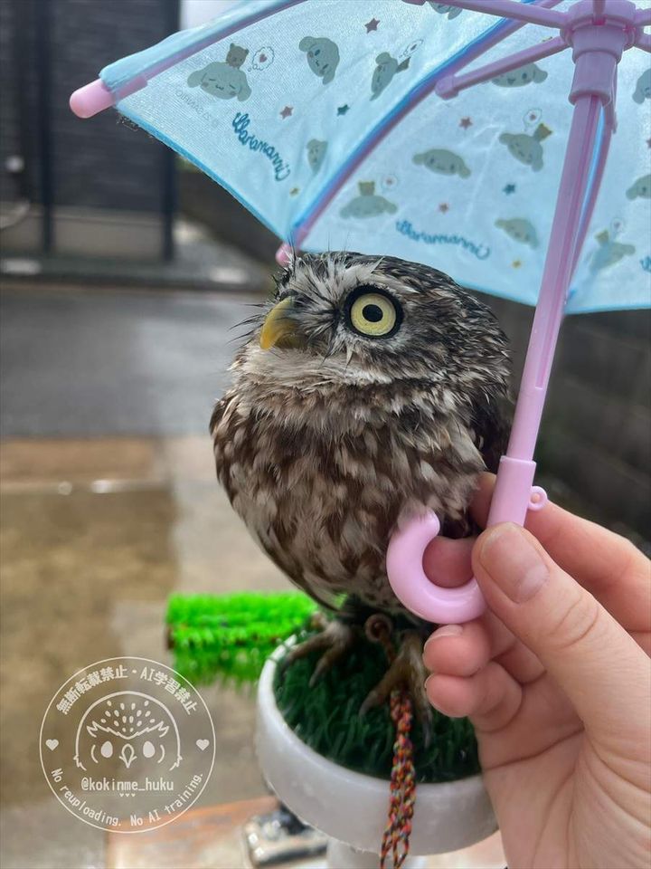 雨の中、飼い主さんと外に出たフクロウ。 傘をさしてもらっているその姿がかわいすぎると話題となっています!