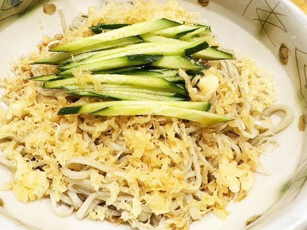 そば全体にカラリと揚がった揚げ玉が散りばめられているのが印象的。カリッとした食感です。コシのあるするりとした食感のそばと一緒に食べれば、揚げ玉の食感がアクセントになって楽しい! どこから食べても揚げ玉と一緒に食べられるのは、このレイアウトのおかげかも。しかも、かつおだしのきいたつゆがしみ込んでも、最後までカリカリ感が残っていたのもうれしかったです。細切りのキュウリは、そばの細さと変わらないので同時にスルスルと食べられるのもポイントです。
