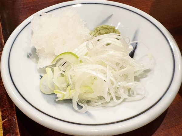 「冷やしたぬき」は、揚げ玉とキュウリのみのシンプルな一品。薬味に大根おろしが付いているのがポイントです。
