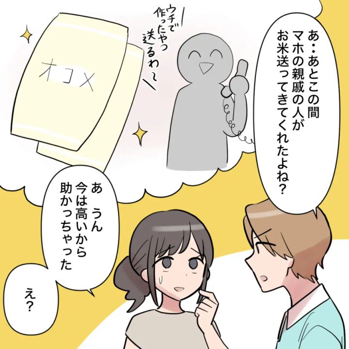 「あ・・あとこの間マホの親戚の人がお米送ってきてくれたよね?」とオサム。「あ、うん。今は高いから助かっちゃった。え?」何事かと思って聞き返すと、