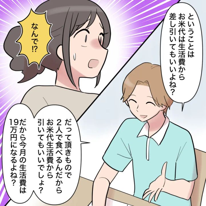「ということは、お米代は生活費から差し引いてもいいよね?だっていただきもので、2人で食べるんだからお米代生活費から引いてもいいでしょ?だから今月の生活費は19万円になるよね?」と言い出し、「なんで!?」と言うも、