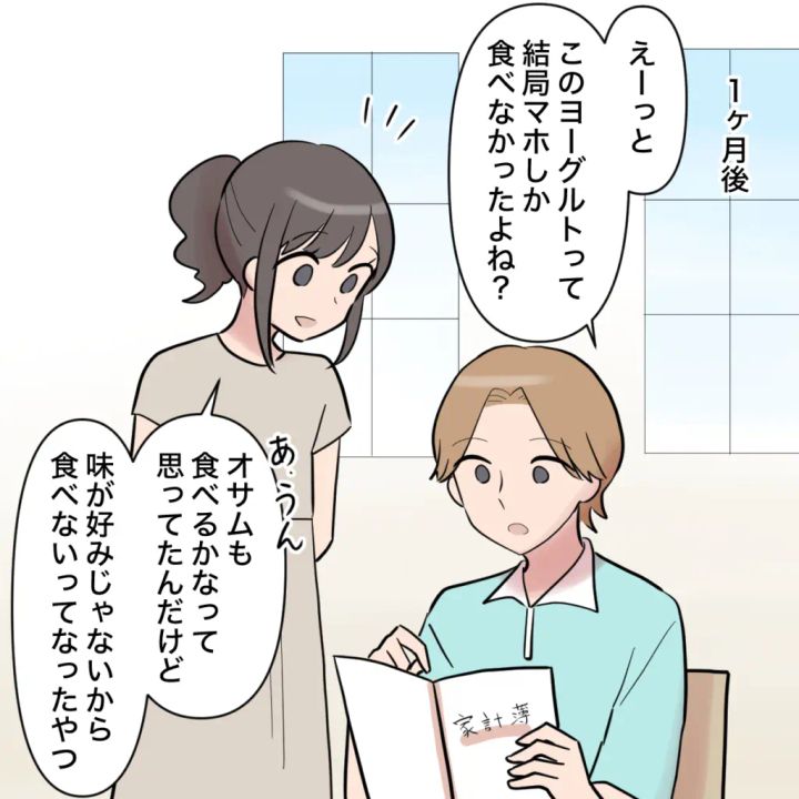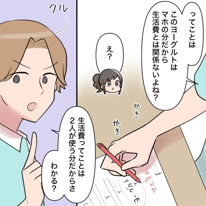 「ってことは、このヨーグルトはマホの分だから、生活費とは関係ないよね?」と家計簿にペンで印を付け出すオサムに、「え?」と言うと、「生活費ってことは、2人が使う分だからさ。わかる?」と言われ、