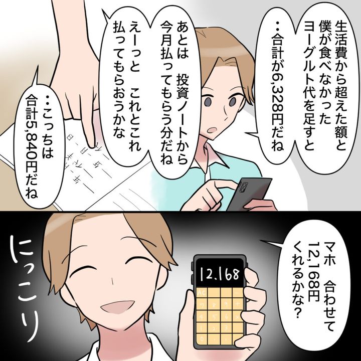 「生活費から超えた額と、僕が食べなかったヨーグルト代を足すと・・合計が6,328円だね。あとは、投資ノートから今月払ってもらう分だね。えーっと、これとこれ、払ってもらおうかな・・こっちは合計5,840円だね」電卓を叩きながらそう言うと、「マホ、合わせて12,168円くれるかな?」そう言ってニッコリ笑うのでした。