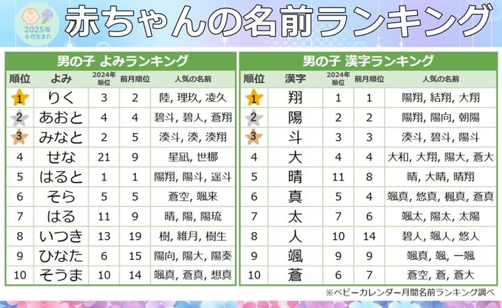 2025年6月に誕生した男の子の赤ちゃん・3,935名の名前を調査! 今回は、男の子に人気の名前の漢字ランキングとトピックを紹介します。男の子の名付けの命名トレンドは、季節感ある「葵」でした。