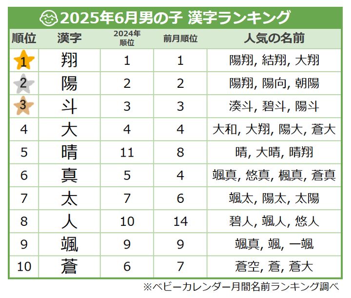 6月の男の子の漢字ランキングTOP5は、1位「翔」、2位「陽」、3位「斗」、4位「大」、5位「晴」という結果でした。