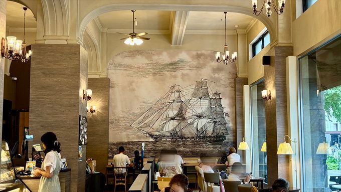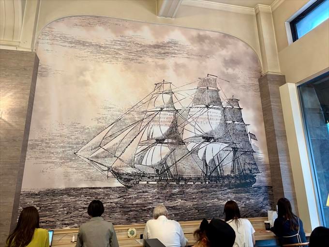 店内で1番目立っているのが、奥の壁一面に描かれた船の絵です。これは、横浜の歴史をイメージし、歴史的建造物と調和するようにデザインされた絵だそう。横浜ならではの“港町の歴史”を感じることができます。