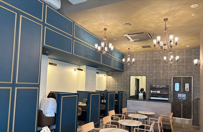 作業目的の方におすすめしたいのは、仕切りのあるお1人様用の席です。青を基調としたデザインが特徴ですが、これは海をイメージして塗装されたそう。横浜らしさを感じながらいつもとは違った空間で、作業したい時にぴったりです。
