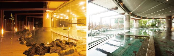 天然温泉の露天風呂と大浴場。泉質はアルカリ性単純温泉で、湯上がり肌はすべすべに