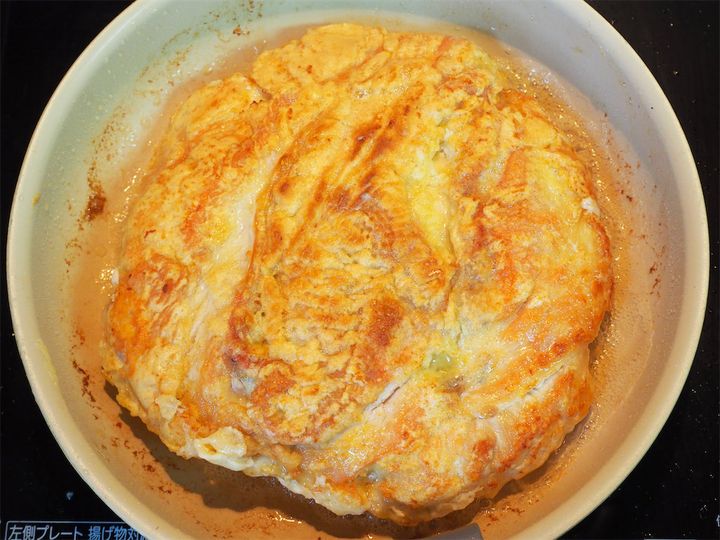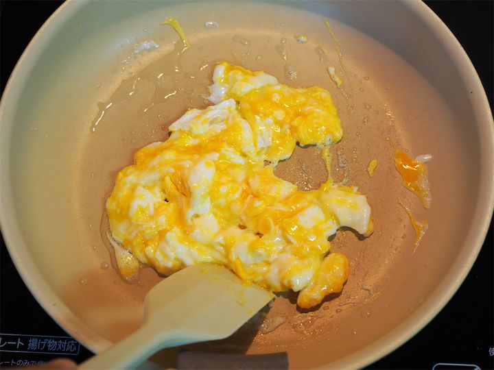 加熱しすぎるとボソボソしてしまうため、ゆるめのオムレツやスクランブルエッグを作る感覚でサッと火を通す程度でOK。余熱でも火が通るので、少し早めに取り出すといいでしょう。白身と黄身はそんなに混ぜ合わせなくてもいいとのこと。