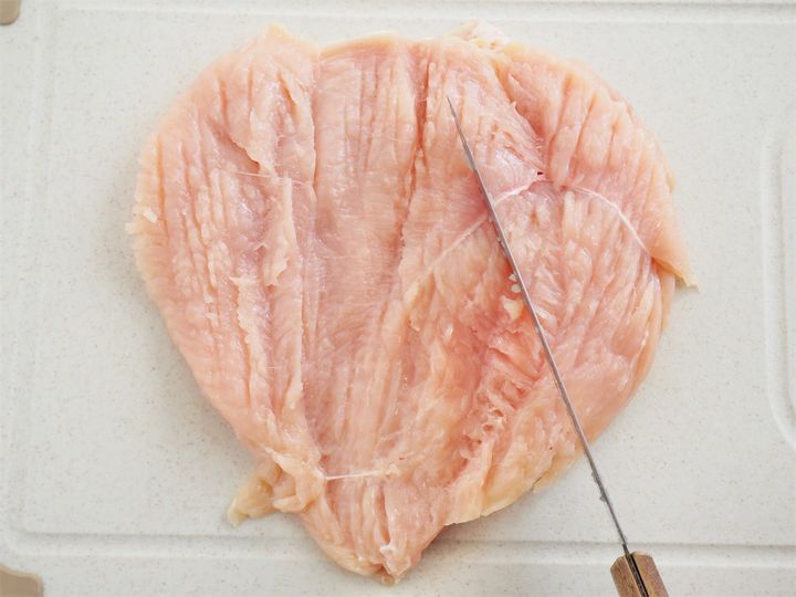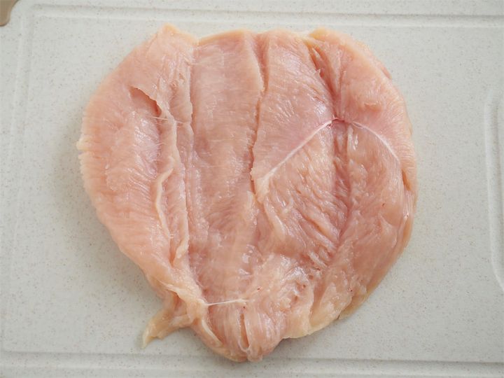 1. 皮を下にして鶏肉をまな板に置き、真ん中に切り込みを入れたら観音開きにする。