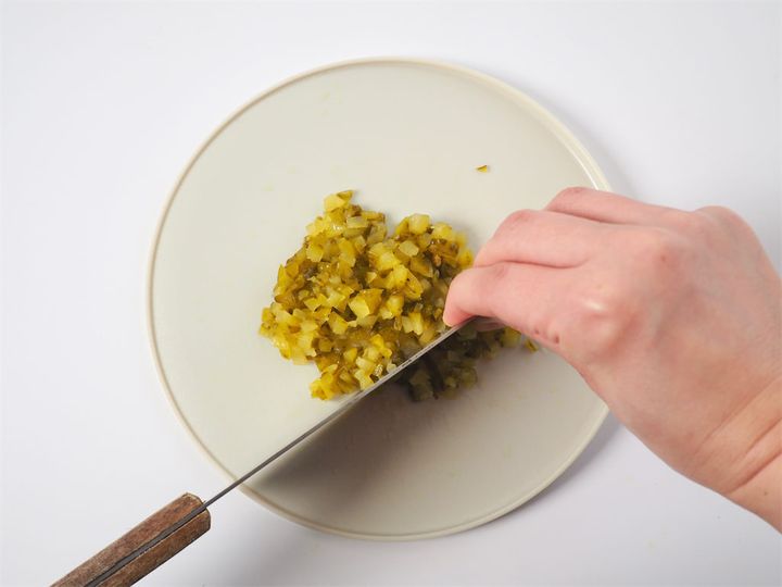 タルタルソース用のピクルスは、柴漬けやらっきょうでも代用可。玉ねぎを使わない理由は、時間が経つと水っぽくなってきてしまうからなんだそう。