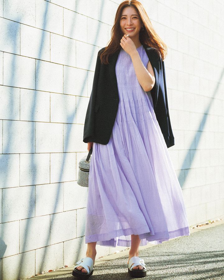 ワンピース¥28,600(ヌキテパ)ジャケット¥24,970(アンクレイヴ/アンクレイヴ〈オンワード樫山〉)バッグ¥14,300シューズ¥18,150(ともにダイアナ/ダイアナ 銀座本店)ピアス¥2,750〈シースキー〉リング¥36,300〈mysha〉(ともにロードス)
