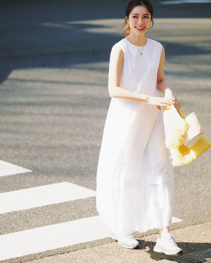 ワンピース¥24,200(アンクレイヴ/アンクレイヴ〈オンワード樫山〉)バッグ¥19,800(アドカラム/アンソロジー)シューズ¥22,000(アシックス/アシックスジャパン カスタマーサポート部)サングラス¥1,990(ユニクロ)ピアス¥118,800〈ウノアエレ〉ブレスレット¥49,500リング¥30,800〈ウノアエレシルバーコレクション〉(すべてウノアエレ ジャパン)