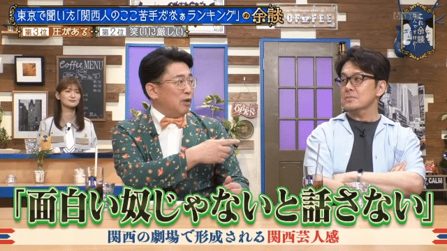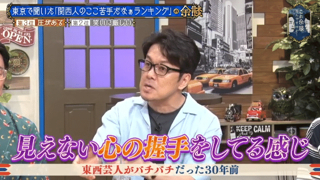 関西芸人の笑いへの厳しさが語られる中で、「土田さんも『面白い奴じゃないと話さない』ぐらいの感じだった」と、若手時代の土田晃之が尖っていたことを明かしたのはビビる大木。山内が「その頃は関西芸人オラァだったんですか?」と質問すると、土田は「僕らの時は今よりも全然関東と関西仲悪いから。NHKか何かで東西(の芸人が出る)みたいな特番があった時の楽屋は大部屋だったけど、エグかった」と回顧。濱家が「もうバチバチで?」と尋ねると、土田は「もうバッチバチ。何かもう向こうは向こうでこっち見てて、『お前誰やねん』みたいな感じだし、こっちはこっちで『お前やってやるぞコラ』」と、当時の楽屋で繰り広げられていた東西お笑いバトルを振り返った。