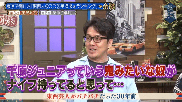 そんな中、当時関西で放送されていたお笑い番組に行くことが決まったという土田。「大阪の番組に行くんだ」と楽しみにしていたところ、大阪出身で東京の芸能事務所に入っていた芸人から、「千原兄弟には気をつけろよ』と言われたと述懐。「千原ジュニアっていうのはナイフを持ってて…。当時はインターネット今ほどじゃないから、ホント河童や天狗とかと一緒。千原ジュニアっていう鬼みたいな奴がナイフ持ってると思ってて…。で行ったら会わなかったんだけど」と振り返った。