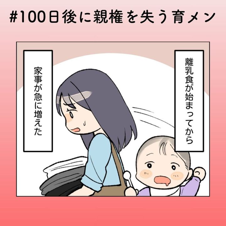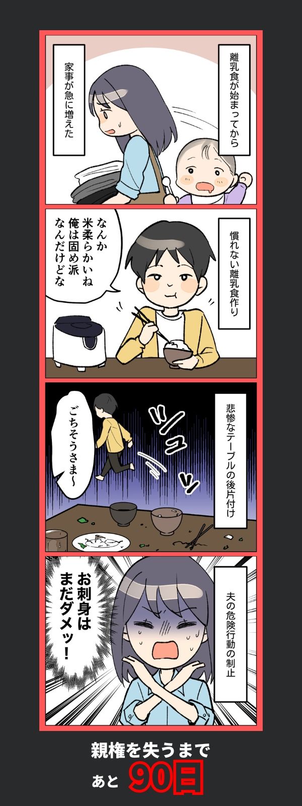 今回は連載『100日後に親権を失う育メン』の第10話。離乳食が始まって、忙しさに更に拍車がかかった奥さん。どうやら赤ちゃんのお世話だけでなく、夫の行動にも振り回されているみたいで……?(毎週木曜日更新)