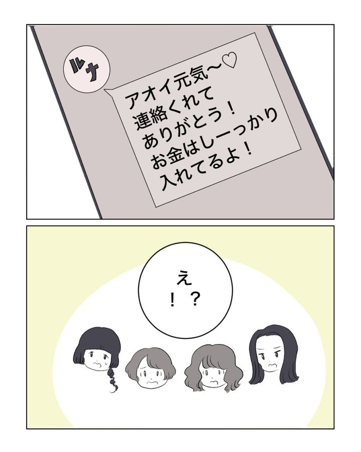 ルナさんからのメッセージには、「アオイ元気~!連絡くれてありがとう!お金はしーっかり入れてるよ!」と何も悪びれていない返信が!「え!?」それを見て、そこにいた全員が驚きました。