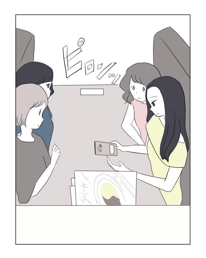 メッセージの届いたアオイさんのスマホを、みんなでジッと見つめる4人。