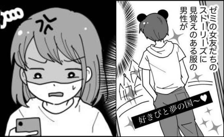 彼と付き合ってしばらく経ったある日のこと。彼が友人の結婚式で地元に帰るとのことで、3日間家を空けた日がありました。まったく疑うことなく彼を見送った私。半同棲状態だったので、久しぶりの1人時間を満喫しようと思っていました。その後、何気なくSNSを眺めていると……同じゼミの女友だちのストーリーズ……24時間で消えるリアルタイムの投稿に、見覚えのある服装の男性が。後ろ姿だったので顔は見えませんでしたが、心がザワつきひとまずスクショ。