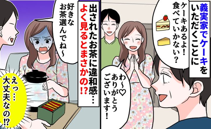 義母「好きなものどうぞ♡」義実家でケーキをいただくことに。え!?出されたお茶に違和感!よく見ると