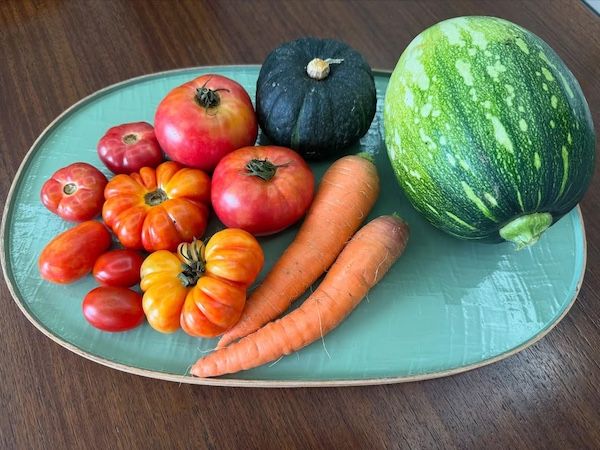 その写真には、立派なニンジンやトマト、カボチャ、ズッキーニなど、色とりどりの野菜が整然と並んでいる。