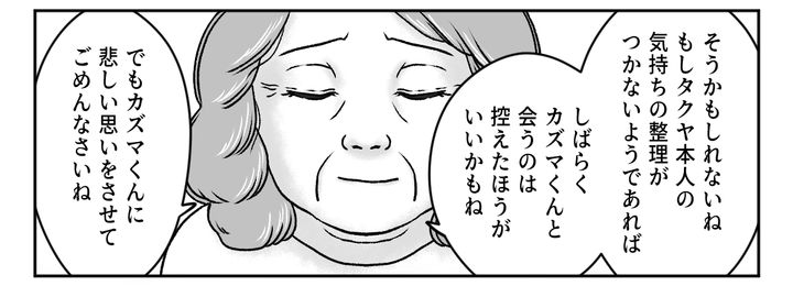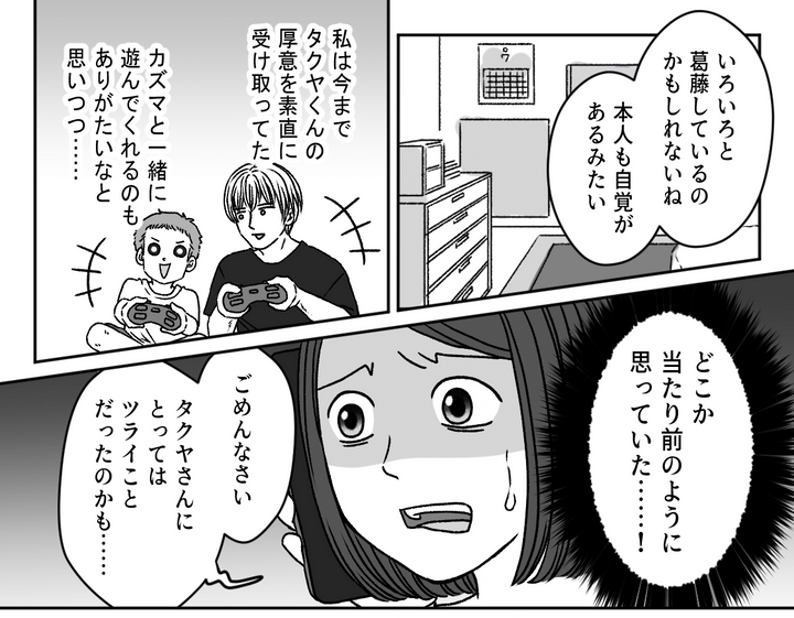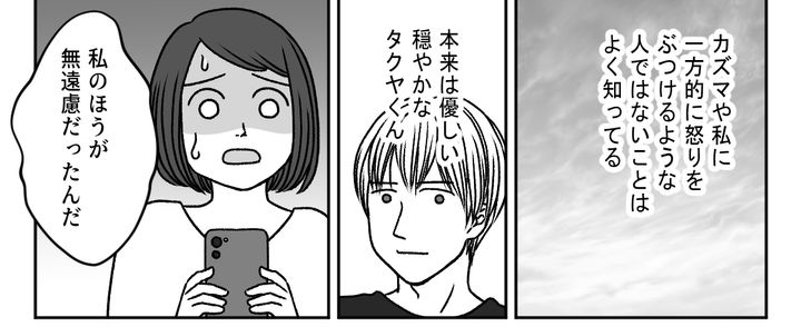 カズマが生まれたときに感激して大喜びしていたタクヤくんの姿を思い出しました。本来は優しい、穏やかなタクヤくん。カズマや私に一方的に怒りをぶつけるような人ではないことは、十分に知っています。私のほうが無遠慮だったかもしれません。
