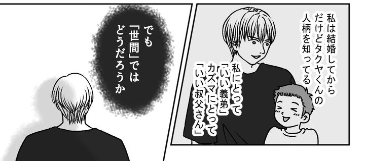 義母の質問にハッとしました。私は結婚してからですが、タクヤくんの人柄を知っています。私にとって「いい義弟」、カズマにとって「いい叔父さん」です。でも「世間の目」からでは、タクヤくんはどう見られているのでしょうか。