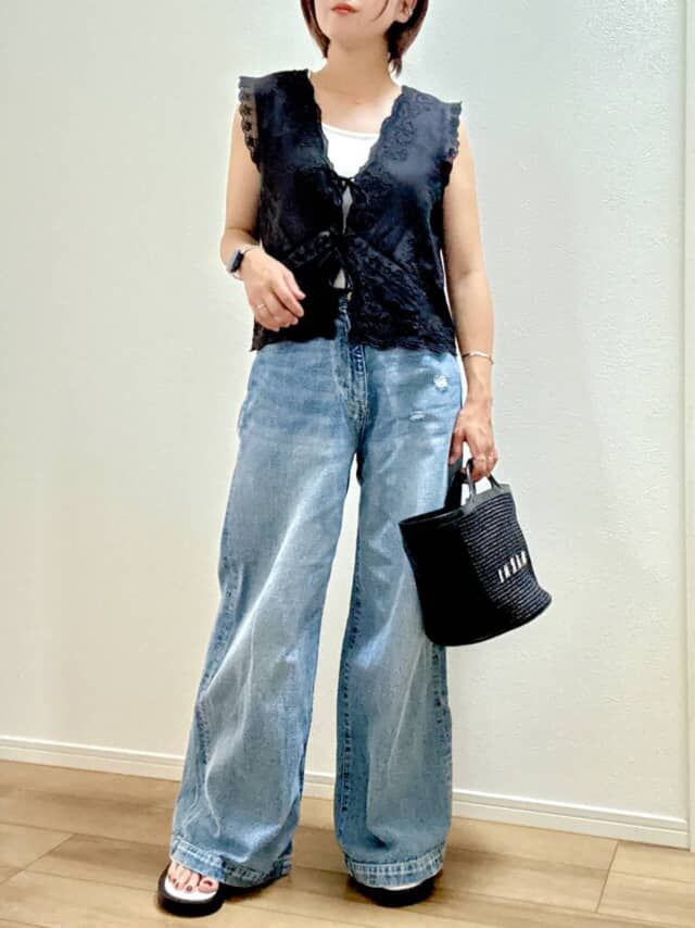 刺繍があしらわれた黒レースは甘すぎず、白インナーを仕込めば程よくレースが引き立ち、バランスの良いスタイルに。ちょっとしたお出かけにもぴったりな、ワンランク上の夏デニムコーデが叶います。