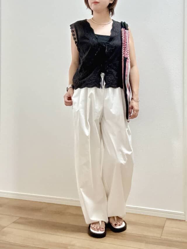 夏に欠かせないのが、快適さ抜群のイージーパンツ。シャカシャカとしたナイロン素材のボリュームパンツには、ZARAの黒レースベストが驚くほどフィットします。短め丈のコンパクトなデザインがボトムのボリューム感と好バランス。