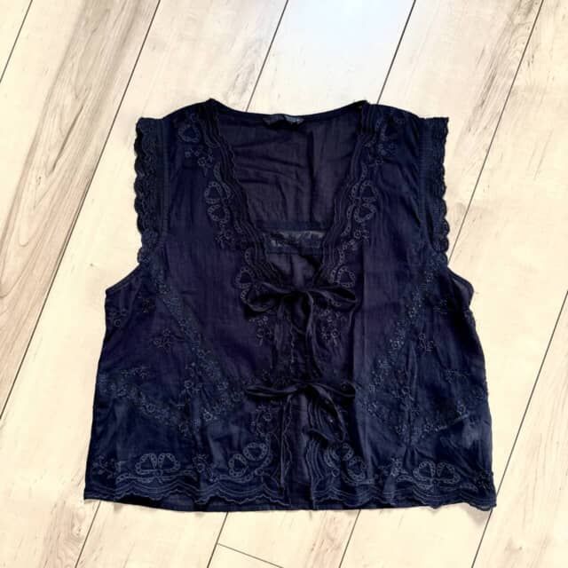 Tシャツだけじゃもの足りない。カジュアルがしっくりこなくなった——そんなときにこそ、レースや刺繍の繊細な甘さが効いてきます。このZARAの黒レースベストなら、女っぽさとカジュアル感のいいとこ取りが可能。