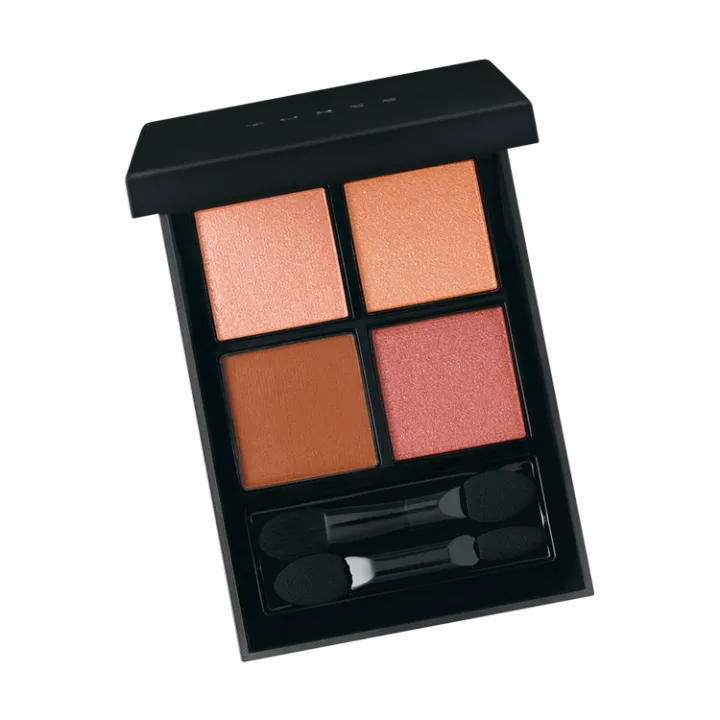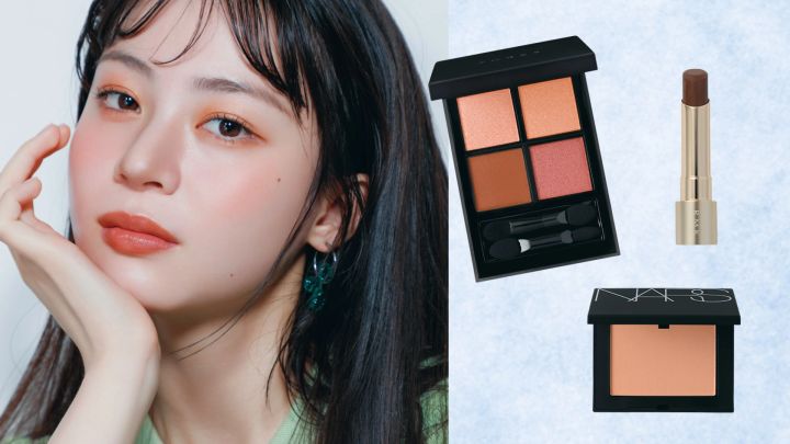 締め色を効かせたアイメイクは、まだまだ暑い夏には重たすぎる印象になりがち。新作アイパレでも、明るいオレンジやコーラルのニュアンスときらめきだけをまとうように薄くオン。