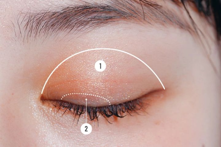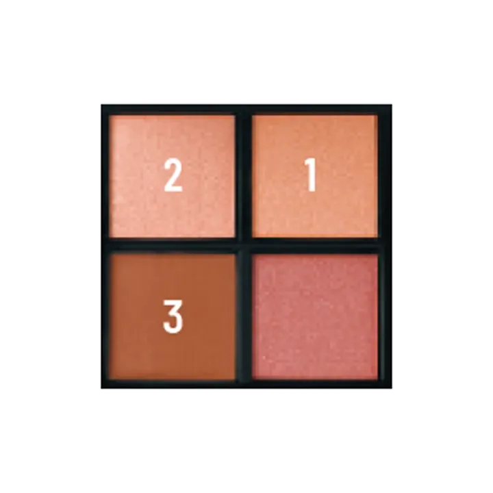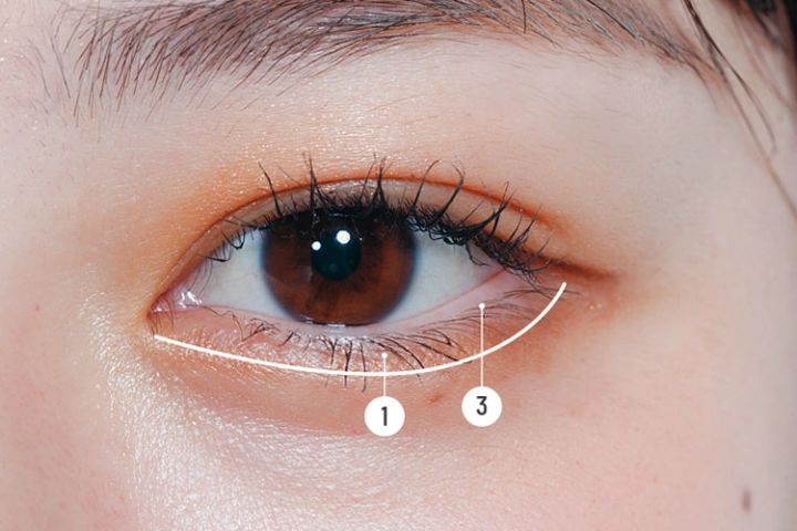 アイパレの1を上下まぶたに塗る。2を上まぶたのきわに黒目の幅で重ね、3を下まぶたのきわに目尻~黒目の範囲で入れて、ナチュラルな陰影を出す。