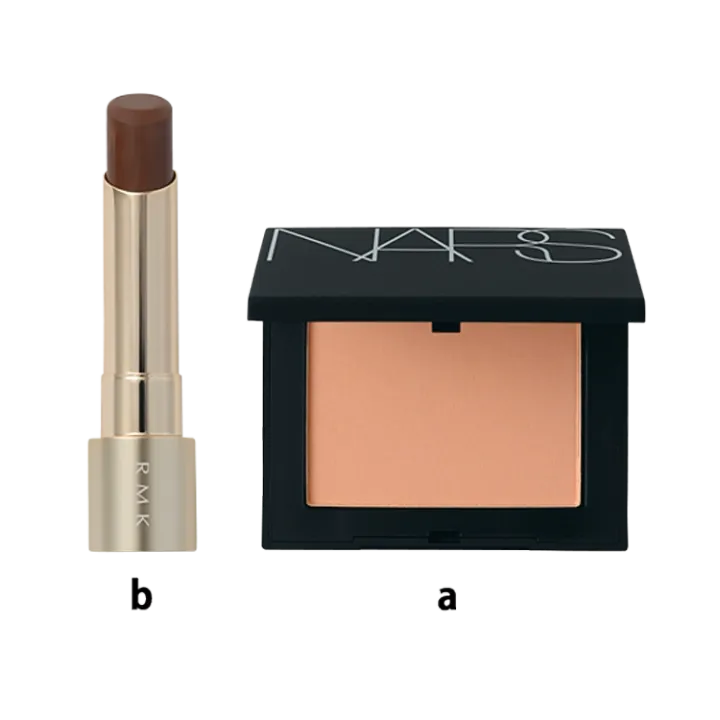 チークは目元とリンクする淡い色のaを使用。ほお高め位置に横長のだ円を描くように広めにのせる。リップはbをラフに直塗り。