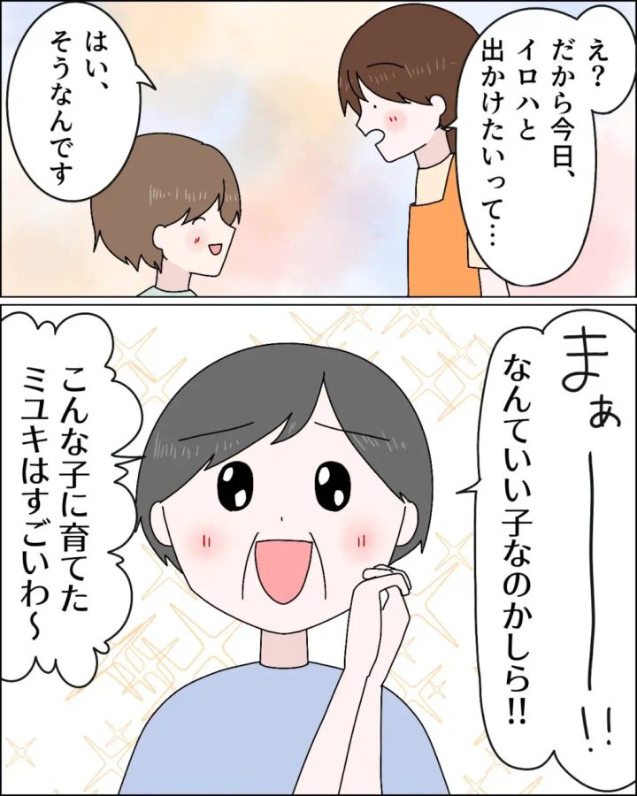 それを聞いてピン!と来た私。「え?だから今日、イロハと出かけたいって・・」とたずねると、「はい、そうなんです」とミコトくん。すると、「まぁーーー!!なんていい子なのかしら!!こんな子に育てたミユキはすごいわ~」と義母が絶賛!