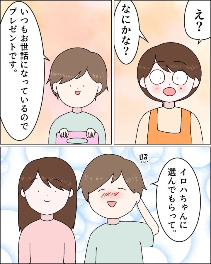 ミコトくんのプレゼントはなんと私に!!「え?なにかな?」と照れながらそう聞くと、「いつもお世話になっているのでプレゼントです」そう言った後、「イロハちゃんに選んでもらって」とミコトくんが照れながら言いました。