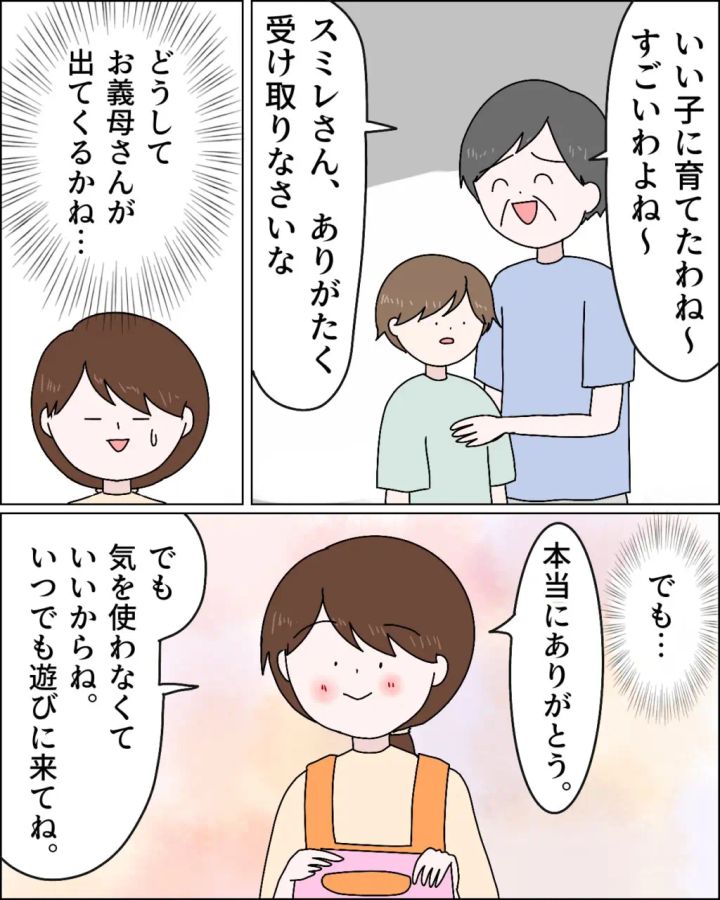 さらに、「いい子に育てたわね~。すごいわよね~。スミレさん、ありがたく受け取りなさいな」と義母が言い、「どうしてお義母さんが出てくるかね・・」と呆れたものの、「本当にありがとう。でも気を使わなくていいからね。いつでも遊びに来てね」とミコトくんに言った後、