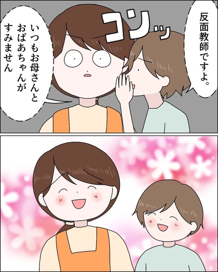 「反面教師ですよ。いつもお母さんとおばあちゃんがすみません」と耳元でささやくミコトくん。それを聞いて、二人で思わず笑ってしまいました。