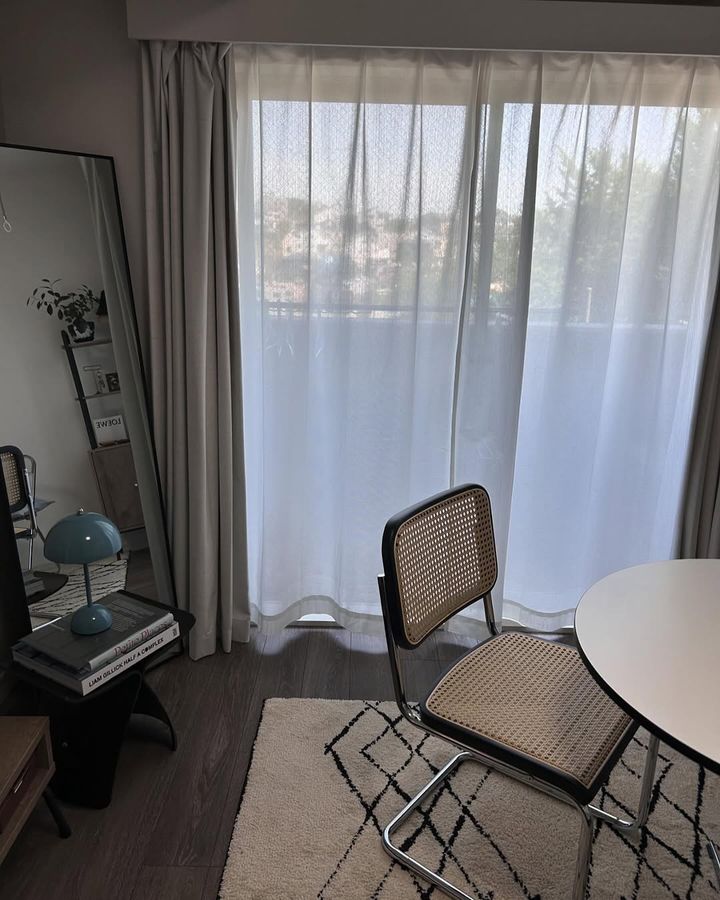 もうひとつ、「買ってよかった」と教えてもらったのは、左側のクローゼットの前に置かれたカフェテーブル。椅子のデザインとお揃いで、小さなお部屋でもじゃまにならないサイズ感が絶妙です。クローゼット前に置いたことで立ったまま作業をしたり、ちょっとものを置いたりに便利なのだそう。